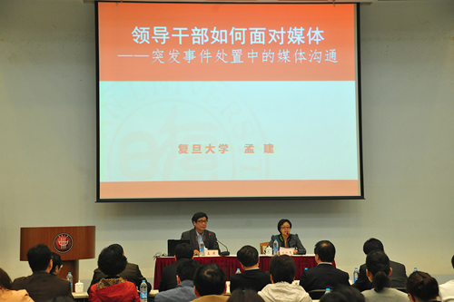 孟建从中央对领导干部能力建设的新要求、在与媒体合作服务的基础上学会应对、全媒体环境下媒体沟通的运作机制和运作流程、全媒体环境下新媒体的传播特点、提高全媒体拓展运用能力等方面,就当前如何做好突发事件中媒体应对工作做了系统讲解。他指出,领导干部学会同媒体打交道的能力,是中央对各级领导干部能力建设提出的新要求。各级领导干部要树立正确的媒体观,克服在媒体应对中普遍存在的“不愿说、不敢说、不会说”的“三不”现象,要主动学会与媒体的合作和服务,切实增强本单位的软实力。