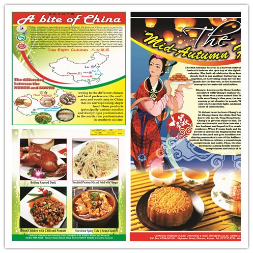 此次孔院日适逢中秋佳节,孔院老师不仅制作了有关中秋文化的宣传海报,还特地从肯尼亚首都内罗毕购买“中国进口”月饼,为孔院日增添了中秋元素。客人们一边观赏纪录片《舌尖上的中国》,品尝中肯美食,一边和孔院师生交流有关中国菜的做法以及中肯饮食文化的差别。