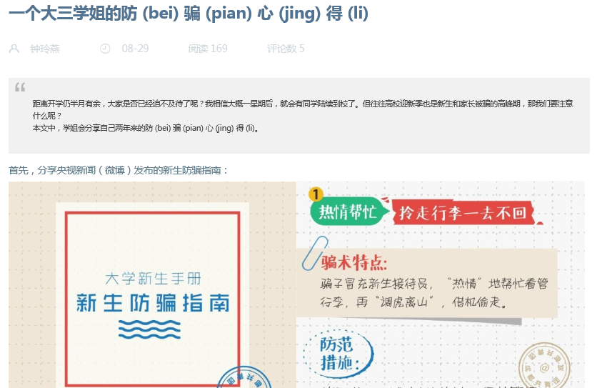 服装学院易班发展中心学生团队策划了迎新主题的系列话题,以“来自半成老腊肉的真人东华‘历险记’”为主题,生动幽默地介绍学院特色、易班资源、校园生活等信息,让新生提前了解大学生活。系列话题包括易课堂番外篇、DHU介绍篇、饮食篇、学习篇、寝室篇、娱乐篇、到校路线篇、地铁公交篇等几大主题,篇篇内容丰富,语言极为生活化,并配有详细的图解,完全符合95后阅读审美。