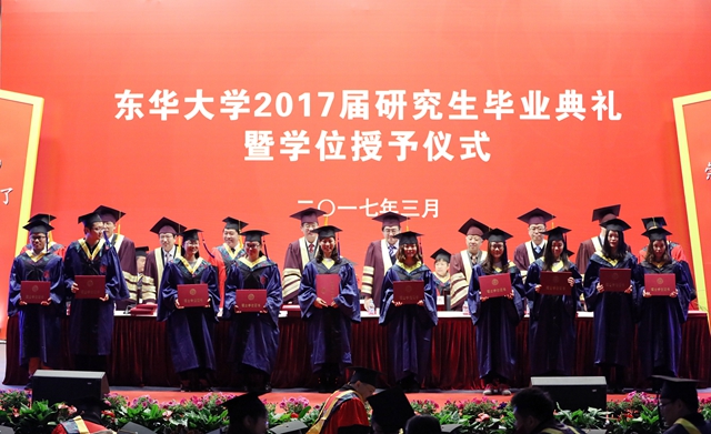 3月22日,我校2017届研究生毕业典礼暨学位授予仪式先后在松江和延安路校区举行,163名博士、987名硕士依依惜别母校,扬帆起航。校党委书记朱民,校长、校学位评定委员会主任蒋昌俊,中国工程院院士俞建勇,校党委副书记崔运花,党委副书记、纪委书记金海燕,副校长刘春红、邱高、李永智、卿凤翎、陈革出席毕业典礼。典礼由邱高主持,各院系领导、导师代表、全体毕业生和家长代表一起见证这一难忘时刻。