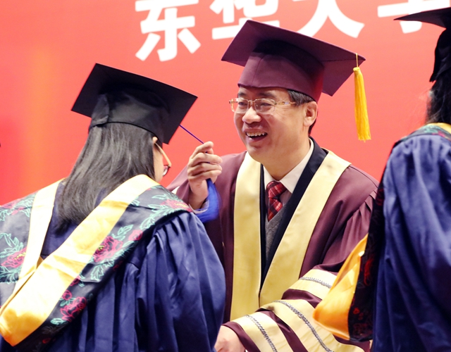 毕业典礼上,环境科学与工程学院 2015级环境工程专业研究生孙璐璐、旭日工商管理学院 2015级旅游管理专业研究生光善军代表在校研究生为毕业的学长学姐送上祝福。校学位评定委员会秘书长、研究生部主任舒慧生宣读校学位授予决定。最后,与会校领导、院士与各学院负责人代表依次为1150名毕业生颁发学位证书并行拨穗礼。在《凤凰花开的路口》这首饱含别离和祝福的歌声中,毕业典礼圆满结束。