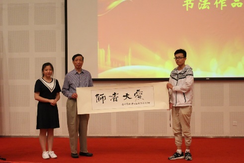 (学生代表向陈全伦老师送上“师者大爱”书法作品)