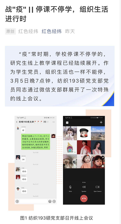 在学院党委的号召下,纺织学院各学生支部通过线上“云”组织生活的方式,借助学习强国平台,以交流讨论、视频会议等形式召开了一场主题为“一心‘移疫’,筑起战‘疫’青春防线”的组织生活会。各学生支部组织党员认真学习领会党中央疫情防控指示精神和学校防控工作要求,纷纷表达了要一切行动听指挥,做好科学防控知识的传播者,认清在疫情防控工作中肩负的责任和使命。其中,学生党员赵泽阳在参与后说道“在这次疫情中,我深刻感受到了万众一心齐心抗疫的中国精神,我作为一名中国人感到骄傲;而作为一名纺织人,疫情防控工作中的纺织力量也让我更加坚信了我的专业选择。”与此同时,学院通过红色经纬微信公众平台,先后推出了由学院党员师生带头主动发声的“十句箴言牢记心”的倡议书,“战‘疫’纺院党员说”“战‘疫’纺织人战疫故事”等专题系列宣传帖,在网络上倡导人人守责、人人担责、人人尽责,为打赢这场战役树立信心和勇气。