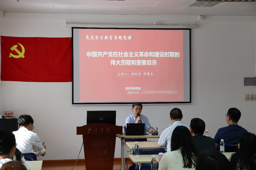 5月31日,副校长舒慧生来到纺织学院,就“中国共产党在社会主义革命和建设时期的伟大历程和重要启示”主题,为学院师生讲授党史学习教育专题党课。学院班子成员、支部书记、系(室、中心)主任、青年教师、舒慧生副校长所联系基层党支部的全体党员参加了此次党课学习。