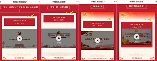 教师领讲有知有味。围绕党史重大事件和学生实际,学院专业课教师、辅导员以中国共产党党史上的系列“第一”为立足点,依托主题班会、理论宣讲、对话访谈、主题党课等形式,自主设计“初心如磐:百名机械人说百年”专题党课栏目,将党史学习教育融入思想政治教育全过程,打造有知有味的“党史融”大思政育人课堂。目前已推出《从“亢慕义斋”到中国共产党》、《从党史中感悟劳动精神》《缪伯英:中共第一位女党员》《李大钊:马克思主义的首倡者》、《南昌起义:熔铸中国共产党战斗属性的历史起点》《党旗的诞生及历史演进》等十余期专题党课,不断推进思想政治教育与党史学习教育迈向新高度。