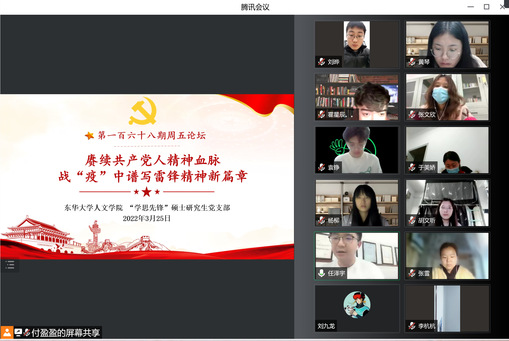 为贯彻落实习近平总书记关于学习雷锋精神和弘扬伟大抗疫精神的重要讲话精神,强化党员青春奉献、带头示范的责任担当,汇聚勠力同心、共克时艰的团结伟力,3月25日,人文学院学思先锋硕士研究生党支部开展第168期周五论坛——赓续共产党人精神血脉,战“疫”中谱写雷锋精神新篇章。学院党委书记韩哲宇、党委副书记资雪琴、学生工作办公室主任汪永安、党建辅导员穆莉、党支部全体党员和入党积极分子参加活动。