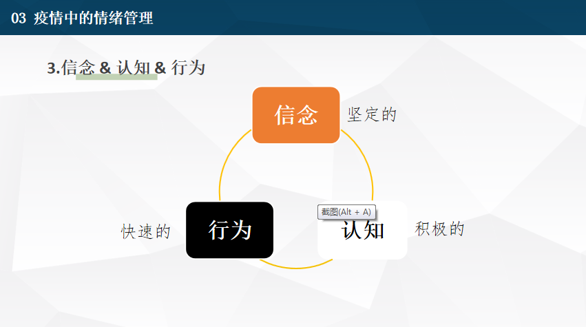 在讲座中,段鑫星聚焦疫情下生活方式的变化,概括总结了安全感、控制感、信任感、自尊、关系等五种人的需要所面临的现实挑战。从现实生活中“想法中最多的是什么”“情绪反应有什么不同”等七个问题出发,概括提出接纳、积极认知、觉察情绪、目标签订等十个心理建设方法。她还提出要从情绪自我照顾、情绪自我服务两个维度,以及“倦怠”“焦虑”“愤怒”“轻信”等10种常见心理状态出发,做好情绪管理和自我心理建设。