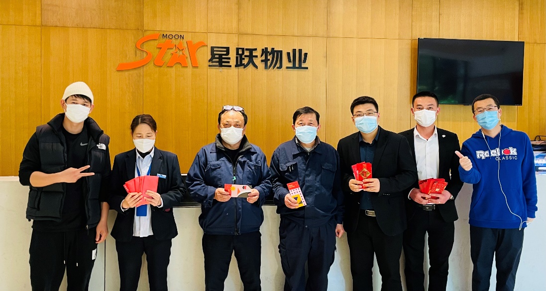 杨旭东(右一)组织街区居民为24小时坚守一线的物业管理人员捐款