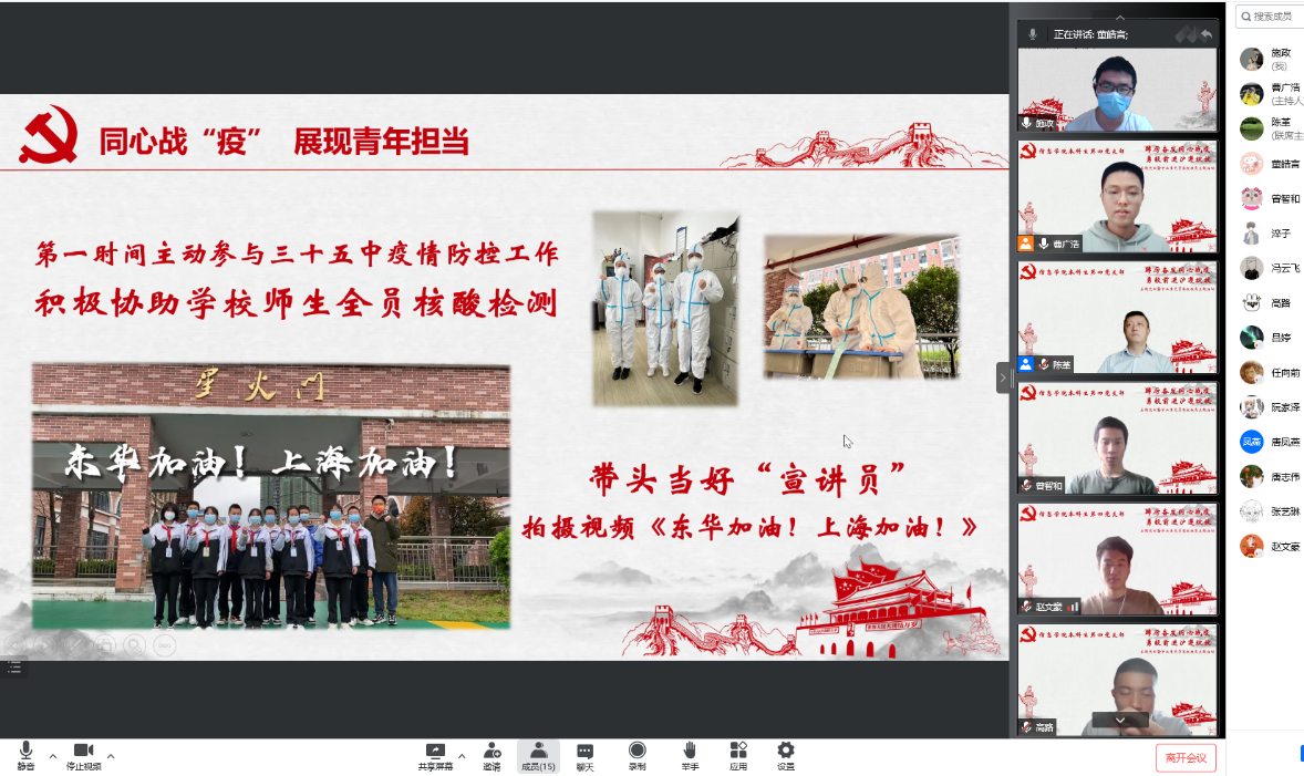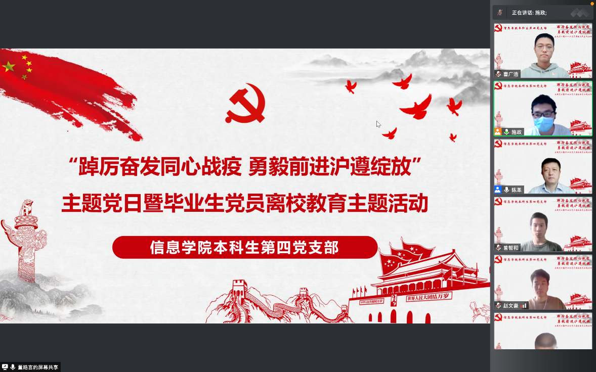 为深入学习贯彻习近平总书记在庆祝中国共产主义青年团成立100周年大会上的重要讲话精神,做好疫情防控背景下毕业生党员离校教育工作,5月27日,信息学院本科生第四党支部开展“踔厉奋发同心战疫 勇毅前进沪遵绽放”毕业生党员离校教育主题党日活动。副校长陈革出席活动,党支部全体党员参与活动,活动由党支部书记施政主持。