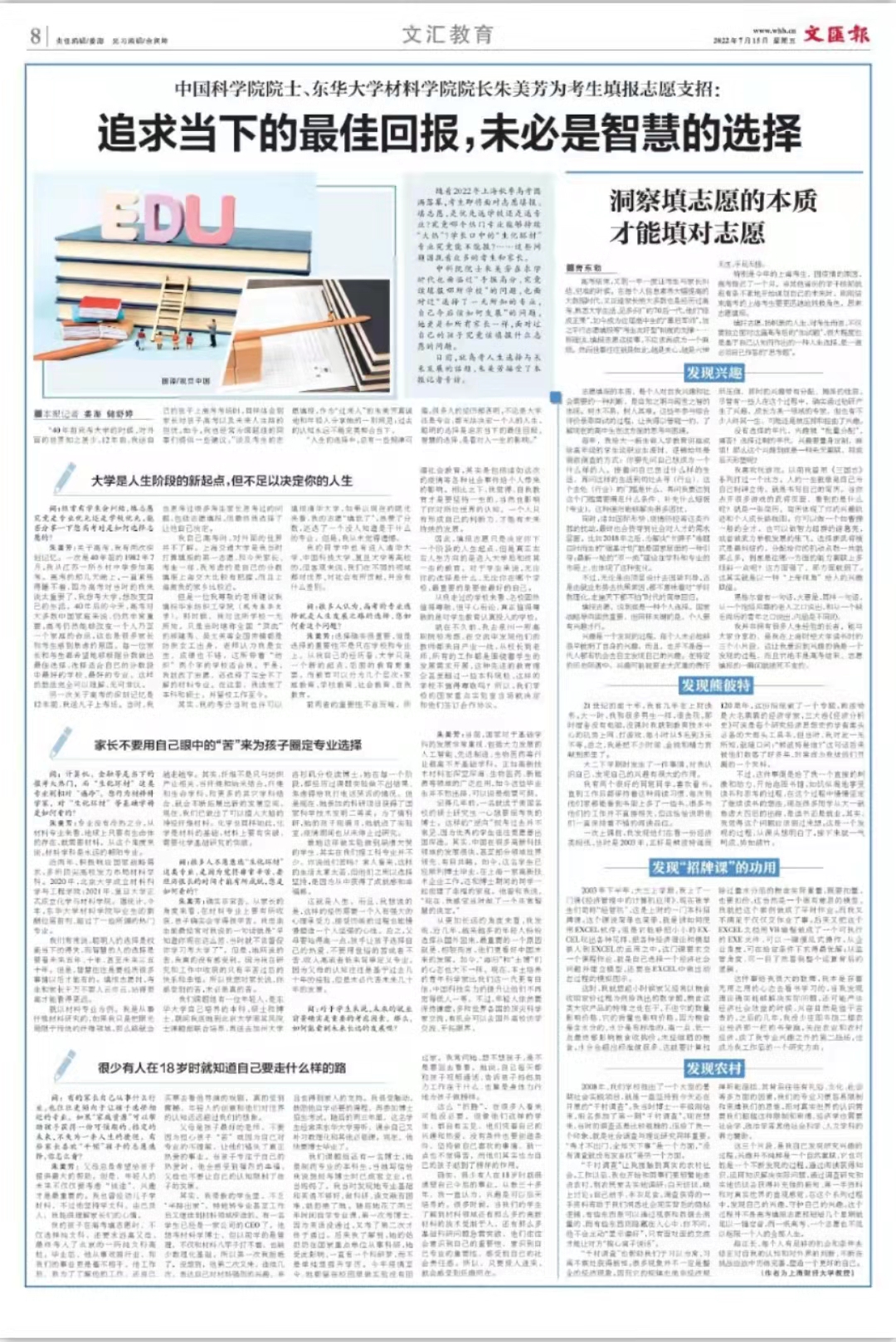 日前,就高考人生选择与未来发展的话题,朱美芳接受了本报记者专访。