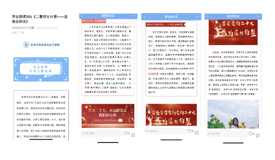 为营造浓厚的党的二十大精神学习氛围,化学与化工学院依托公众号、易班等新媒体网络矩阵加快推动思政教育工作高质量发展,提前谋划开辟线上线下同向发力的常态化学习二十大精神的主阵地,提高政治站位持续更新学习资料,对标上级要求第一时间高质量开辟“学习二十大,我们在行动”、“学习二十大,追这样的星”等精品专栏,引导广大学子往深里学,往高点攀,往实里做。先学一步,学深一层,学院党校聚焦“学习二十大,绽放绚丽青春之花”中心主题,联动特邀党建组织员、关工委教授等多主体,菜单式定制化精心供给优质课程教学内容,线上与线下学将结合,引导与自主学相融通。学院学业支持发展中心制作发布系列学业微课,完整激活学业讲师团的牵引力与示范性,延展学业互助共享学习圈,着力建强落实立德树人根本任务的学风建设共同体,引领学生为中国式现代化和中华民族伟大复兴贡献青春力量。