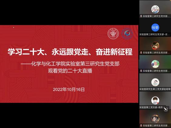 欣逢盛会,共襄盛举。10月16日上午,中国共产党第二十次全国代表大会在人民大会堂隆重开幕。为深入学习贯彻宣传党的二十大精神,化学与化工学院党委高度重视,在全院师生范围内开展“踔厉奋发谱华章,勇毅前行开新局”主题教育活动,引导广大党员师生学思践悟、学深悟透、学以致用。