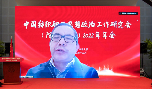 12月14日,由我校承办的中国纺织职工思想政治工作研究会(院校学组)2022年年会在松江校区举行。中国纺织服装教育学会常务副会长倪阳生,中国纺织职工思想政治工作研究会秘书长郑国峰,中国纺织职工思想政治工作研究会(院校学组)会长、北京服装学院党委副书记倪赛力,天津工业大学党委副书记胡英江,武汉纺织大学党委副书记、副校长罗锦银,浙江理工大学党委副书记姚珺,西安工程大学党委副书记井浩,中原工学院党委副书记邹松涛,河南工程学院党委副书记袁静波,成都纺织高等专科学校党委副书记周红等校外领导线上出席。我校党委书记刘承功,党委副书记刘淑慧,党委常委、党委宣传部部长任晓杰线下出席。年会开幕式、闭幕式由刘淑慧主持,主题报告由任晓杰主持。