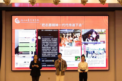 会上,管理学院三位学生代表讲述了管理学院的志愿者故事,呼吁广大青年努力成为堪当民族复兴重任的时代新人,把志愿精神一代代传递下去,让青春在祖国和人民最需要的地方绽放绚丽之花。