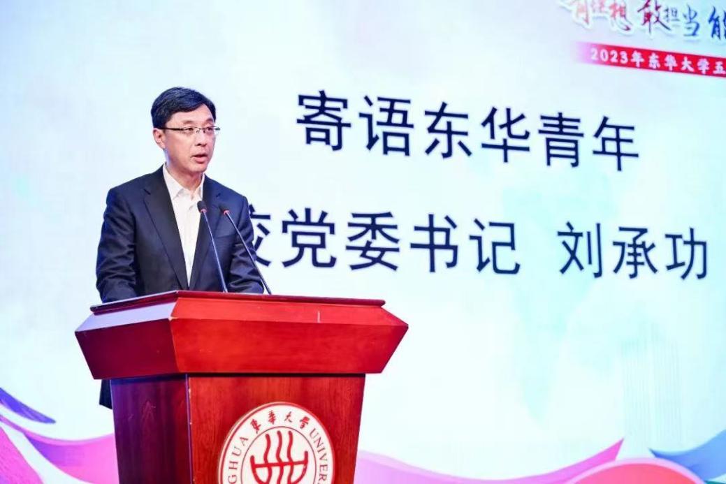 刘承功代表学校党委向全校青年师生和团员青年致以诚挚问候,对获得表彰的集体和个人表示祝贺。他强调,东华青年要继承和发扬“五四”光荣传统,坚持用习近平新时代中国特色社会主义思想凝心铸魂,心有所信、志存高远,牢记使命、勇担重任,不惧困苦、砥砺前行,坚韧不拔、奋力拼搏,听党话、跟党走,不负青春韶华、不负伟大时代,争做“有理想、敢担当、能吃苦、肯奋斗”的新时代好青年。